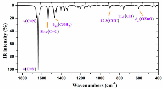 | 610.2 | 67 | 5 | 8.3 | 1.82 | 602 | 588 m | 73% δas(O–Zn–O) + 20%, 6a δ(CCC) in benzene ring |