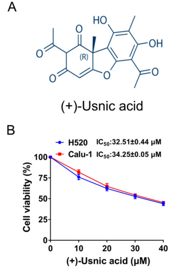 The structure of (+)-usnic acid with the molecular weight of 344.32 g/mol was shown in Figure 1A. Figure 1B shows that (+)-usnic acid treatment for 48 h markedly decreased the viability of two LUSC cell lines (H520 and Calu-1) in a dose-dependent manner, as determined by an thiazolyl blue tetrazolium bromide (MTT) assay, with the half-maximal inhibitory concentration (IC50) of 32.51 ± 0.44 to 34.25 ± 0.05 µM.