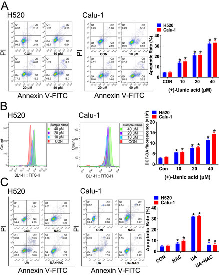 (+)-Usnic acid (UA) induces cell apoptosis via cellular ROS accumulation. (A) The effect of UA (10 to 40 µM) treatment for 24 h on apoptosis of H520 and Calu-1 cells. Significantly different from control group, * p < 0.05, n = 3. (B) The effect of UA at the indicated concentrations on ROS production in H520 and Calu-1 cells. Significantly different from control group, * p < 0.05, n = 3. (C) Administration of NAC (25 mM) efficiently reserved the effect of UA on cell apoptosis determined by flow cytometry. Significantly different from control group, * p < 0.05, n = 3; # significantly different from the group of UA, p < 0.05, n = 3.