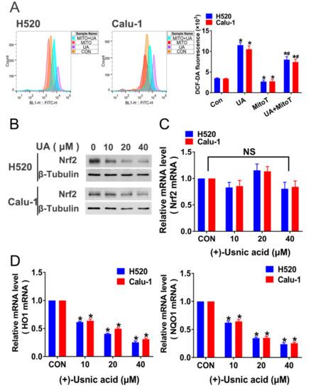Inhibition of Nrf2 expression mediates (+)-usnic acid (UA)-induced LUSC cell apoptosis. (A) Administration of mitochondria-targeted antioxidant, Mito-TEMPOL (MitoT) to UA-treated H520 and Calu-1 cells. The effect of MitoT on ROS production was detected by flow cytometry. Significantly different from control group, * p < 0.05, n = 3; # significantly different from the group of UA, p < 0.05, n = 3. (B) UA (10 to 40 µM) suppressed Nrf2 expression in H520 and Calu-1 cells analyzed by Western blotting after 8-h incubation. (C) The effect of UA on Nrf2 mRNA expression in H520 and Calu-1 cells assayed by q-PCR. NS, not significantly, p > 0.05, n = 3. (D) The effect of UA on the mRNA expression of Nrf2-targeted genes (HO1 and NQO1) in H520 and Calu-1 cells determined by q-PCR. Significantly different from control group, * p < 0.05, n = 3.