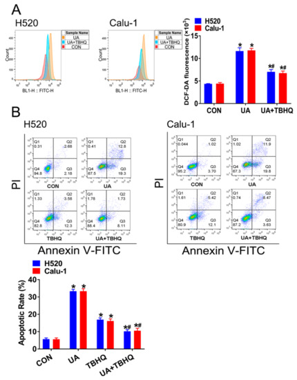 Tert-butyl hydroquinone (tBHQ) reverses (+)-usnic acid (UA)-induced H520 and Calu-1 cell apoptosis and ROS production. (A) TBHQ (20 µM) reversed UA-induced ROS accumulation. Significantly different from control group, * p < 0.05, n = 3; # significantly different from the group of UA, p < 0.05, n = 3. (B) TBHQ (20 µM) blocked UA-induced apoptosis in H520 and Calu-1 cells. Significantly different from control group, * p < 0.05, n = 3; # significantly different from the group of UA, p < 0.05, n = 3.