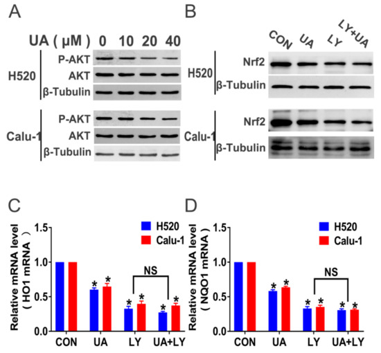 (+)-Usnic acid (UA) suppresses Nrf2 expression via inhibition of the PI3K/Akt pathway. (A) UA inhibited phosphorylated Akt in H520 and Calu-1 cells analyzed by Western blotting after 8-hour treatment. (B) After administration of LY294002 and LY294002 plus UA, the expression of Nrf2 and p-Akt was analyzed by Western blotting. (C,D) After administration of LY294002 and LY294002 plus UA, the mRNA expression of Nrf2-targeted genes (HO1 and NQO1) in H520 and Calu-1 cells by q-PCR assay. Significantly different from control group, * p < 0.05, n = 3; NS, not significantly, n = 3.