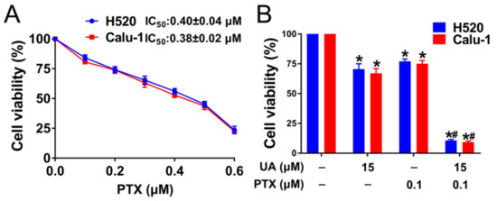 (+)-Usnic acid (UA) enhances paclitaxel cytotoxicity in LUSC cells. (A) Cell viability assessed by MTT after treatment with PTX at the indicated concentrations, n = 3. (B) The effect of UA plus PTX on H520 and Calu-1 cell viability determined by MTT assay. H520 and Calu-1 cells were exposed to different concentration of UA and PTX for 48 h. Significantly different from control group, * p < 0.05, n = 3; # significantly different from the group of UA or PTX, p < 0.05, n = 3.