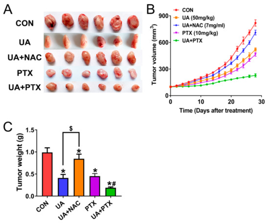 (+)-Usnic acid (UA) inhibits H520 xenograft tumor growth and enhances paclitaxel efficacy in vivo. (A–C) UA (50 mg/kg, thrice weekly, by intraperitoneal injection), UA plus the NAC (7 mg/mL given in the drinking water for the length of the experiment), PTX (10 mg/kg, thrice weekly, by intraperitoneal injection), or UA plus the PTX treatment inhibit tumor volume (A,B) and tumor weight (C). * Significantly different from control group; # significantly different from the group of UA or PTX; $ significantly different between the group of UA and UA plus NAC, p < 0.05, n = 6.