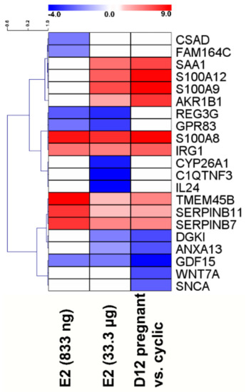 Heatmap of the log2 fold changes (estradiol-17β (E2)-treated endometrium vs. placebo-treated endometrium; day 12 pregnant-cyclic) of the top 10 differentially expressed genes of each gene expression comparison. The scale is from log2 fold change -4 (blue, down-regulated in E2-treated/pregnant samples) to 9 (red, up-regulated in E2-treated/pregnant samples). Each row represents one gene, and each column represents a comparison (E2-treated vs placebo or pregnant vs. cyclic).