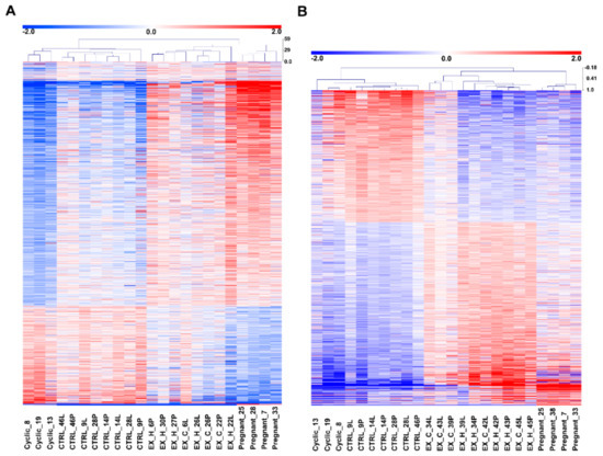 Comparison of transcriptome changes detected in endometrial samples collected from gilts on day 12 of the estrous cycle and pregnancy with the effect of intrauterine estradiol-17β administration (A: 833 ng of E2/infusion; B: 33.3 μg of E2/infusion). Data are shown as a heatmap of hierarchical clustering (Pearson correlation) of the normalized values of the intensity of the expression signals of probes detected as significantly changed (log fold change > 0.585; p nominal < 0.05 false discovery rate (FDR) = 5%) in analyzed groups. Cyclic-endometrial samples collected on day 12 of the estrous cycle, pregnant-endometrial samples collected on day 12 of pregnancy, control-endometrial samples collected from gilts assigned to control groups (infusions of placebo to both uterine horns), EX_H-endometrial samples collected from gilts assigned to the experimental group (uterine horns receiving E2 infusions), EX_C-endometrial samples collected from gilts assigned to experimental group (uterine horns receiving placebo infusion).