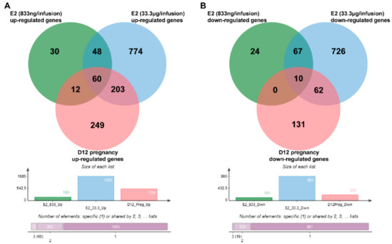 Venn diagrams of common, and group-specific up- (A) and down-regulated (B) genes. D12 pregnancy–endometrial samples collected on day 12 of pregnancy, E2 (833 ng/infusion) endometrial samples collected from uterine horns receiving 833 ng of E2/infusion, E2 (33.3 μg/infusion)—endometrial samples collected from uterine horns receiving 33.3 μg of E2/infusion. Complete lists of common and group-specific DEGs are presented in Supplementary Table S7.