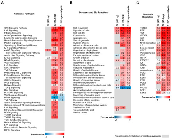 Comparison analysis of canonical pathways (A), diseases and bio functions (B) and upstream regulators enriched by DEGs identified in estradiol-17β-treated (833 ng and 33.3 μg/infusion) and day 12 of pregnancy endometrial samples. A Z-score value higher than 2 means that the enriched pathway (A) or enriched function (B) is significantly activated or stimulated, or the upstream regulator stimulates the set of identified DEGs (C). A Z-score value lower than 2 means that the enriched pathway (A) or enriched function (B) is significantly inhibited or suppressed, or the upstream regulator suppresses the set of identified DEGs (C). Grey color indicates there is no data allowing for activation/suppression or stimulation/inhibition prediction of the enriched term.