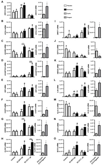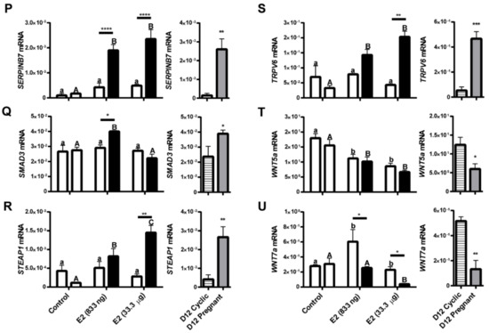 Expression of selected target genes determined by real-time RT-PCR in porcine endometrial samples treated with a placebo (control) or E2 (833 ng and 33.333.3 μg/infusion) and on day 12 of the estrous cycle (D12 Cyclic) and pregnancy (D12 Pregnant). Data are presented as the mean ± SEM. The expression of genes was normalized against the geometrical mean of RPL13A and GAPDH expression values. Different letters indicate statistically significant differences (two-way ANOVA, followed by the Bonferroni post-test; p < 0.05) in the local-indirect effect of E2 on gene expression. Asterisks (* p < 0.05; ** p < 0.01; *** p < 0.001; **** p < 0.0001) indicate the significant differences within the direct local effect of the E2 on gene expression. (A) ATP binding cassette subfamily C member 4 (ABCC4); (B) acyl-CoA synthase long-chain family member 4 (ACSL4); (C) ADAM metallopeptidase domain 9 (ADAM9); (D) ADAM metallopeptidase with thrombospondin type 1 motif 20 (ADAMTS20); (E) Bradykinin Receptor B2 (B2R); (F) caspase 3 (CASP3); (G) CCAAT/enhancer binding protein beta (CEBPB); (H) claudin 1 (CLDN1); (I) deleted in malignant brain tumors 1 (DMBT1); (J) growth differentiation factor 15 (GDF15); (K) heparin binding EGF like growth factor (HBEGF); (L) interleukin 1 beta (IL1B); (M) kelch like family member 14 (KLHL14); (N) lysophosphatidic acid receptor 3 (LPAR3); (O) mucin 4, cell surface associated (MUC4); (P) serpin family B member 7 (SERPINB7); (Q) SMAD family member 3 (SMAD3); (R) STEAP family member 1 (STEAP1); (S) transient receptor potential cation channel subfamily V member 6 (TRPV6); (T) Wnt family member 5A (WNT5A); and (U) Wnt family member 7A (WNT7A).