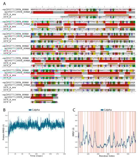 - Terentiev, A.A.; Moldogazieva, N.T.; Levtsova, O.V.; Maximenko, D.M.; Borozdenko, D.A.; Shaitan, K.V. Modeling of three dimensional structure of human alpha-fetoprotein complexed with diethylstilbestrol: Docking and molecular dynamics simulation study. J. Bioinform. Comput. Biol. 2012, 10, 1241012. [Google Scholar] [CrossRef] [PubMed]