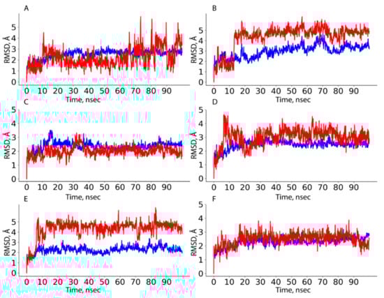 4.4. RMSD and RMSF Calculations for Protein–Ligand Complexes