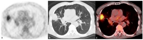 A 79-year-old male affected by pneumonia due to Pseudomonas aeruginosa who was examined by 18F-FDG-PET/CT. The 18F-FDG-PET (a), axial CT (b), and fused image (c) of the 18F-FDG-PET/CT scan demonstrate the pulmonary consolidation, with high tracer uptake, in the middle lobe due to the infection.
