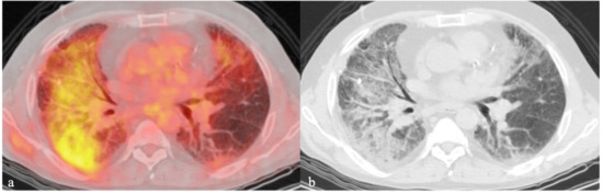 A 60-year-old male with end-stage interstitial lung disease examined by 18F-FDG-PET/CT, which demonstrates the high metabolism (a) of the affected pulmonary areas (b).