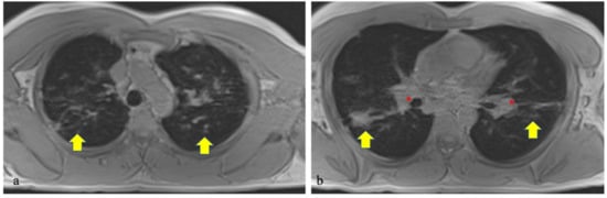 Considering pulmonary inflammatory diseases, fluid-sensitive sequences are very useful in demonstrating active processes [148] and overall MRI allows the characterization of the extent of the diseases and the differentiation between acute inflammation and fibrosis [149,150,151,152,153].