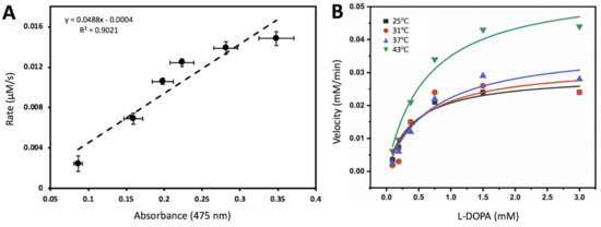Once the correlation between ITC and UV spectroscopy had been drawn, the enzymatic activities of recombinant Tyrtr were further tested in vitro through UV-spectroscopy at four temperatures: 25, 31, 37, and 43 °C. The parameters of Michaelis-Menten enzymatic reaction, affinity constant Km and maximal velocity Vmax of proteins, were calculated using plots shown in Figure 2B and presented in Table 1 for each temperature analyzed with adjusted R2 >0.8.