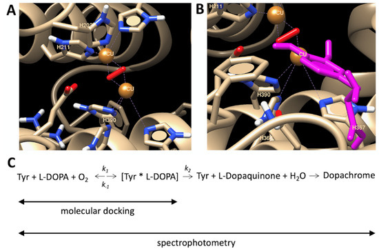 Computational docking of L-DOPA molecule and human tyrosinase. (A) Active center of human tyrosinase is shown. (B) L-DOPA molecule (magenta) is docked in an active site. (C) 4-step reaction of dopachrome formation from L-DOPA, which is catalyzed by Tyr. Symbols k1, k−1, and k2 are catalytic constants. Michaelis constant Km is matching the dissociation constant if assumed that the formation of the product from the tyrosinase-L-DOPA complex occurs at a much slower rate in comparison to the rate of dissociation of the tyrosinase-L-DOPA complex, (i.e., k2 << k−1 of the reaction). Michaelis-Menten kinetics is measured at the dopachrome absorption wavelength (~475 nm). Computational docking measures a binding of L-DOPA in a complex [Tyr*L-DOPA]. Copper atoms and dioxide molecules are shown by orange balls and red rods, respectively.