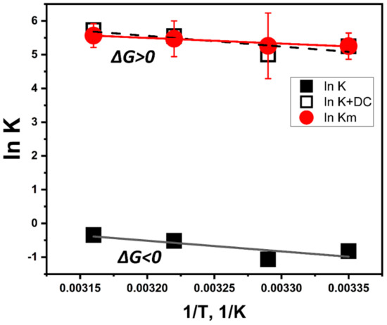 where temperature T is measured in Kelvin (K), R is a gas constant (R = 8.31 J/K/mol), and −∆H/R and ∆S/R are the slope and intercept of the line, respectively. Here, K is an association constant (reciprocal to the dissociation constant) normalized by tyrosinase concentration, [E].