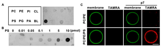 Lipid preference of hepatitis C virus (HCV) p7. (A,B) Lipid preference of p7 by a protein lipid overlay (PLO) assay. (C) p7 interaction with giant unilamellar vesicles (GUVs) composed of PC:PE, 3:1 (mol/mol), or PC:PE:PS, 3:1:1 (mol/mol). GUVs were electroformed with 0.2% TopFluor-cholesterol to visualize the membrane. TAMRA-p7 was applied to examine its targeting to GUVs. The scale bar indicates 10 µm. PC, phosphatidylcholine; PE, phosphatidylethanolamine; PI, phosphatidylinositol; CL, cardiolipin; PS, phosphatidylserine; PG, phosphatidylglycerol; PA, phosphatidic acid; BL, blank.
