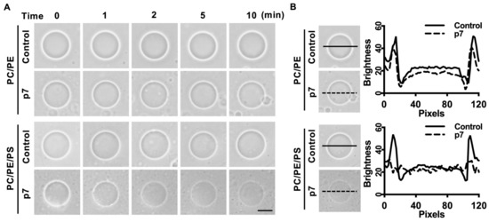 Since p7 has been known to be a pore-forming protein [16], we hypothesized that the interaction between p7 and PS-containing GUV could induce membrane permeabilization. We used phase-contrast microscopy to examine GUV permeabilization. Because GUVs were made with internal buffer (300 mM sucrose) and incubated in external buffer (100 mM KCl, 100 mM sorbitol, and 5 mM HEPES/Tris pH 7), membrane permeabilization could be visualized by the decrease in the phase-contrast effect. As expected, p7 considerably increased the membrane permeabilization of GUV composed of PC:PE:PS when compared with GUV composed of PC:PE (Figure 2A). The decrease in phase contrast was further analyzed by line profiling (Figure 2B).