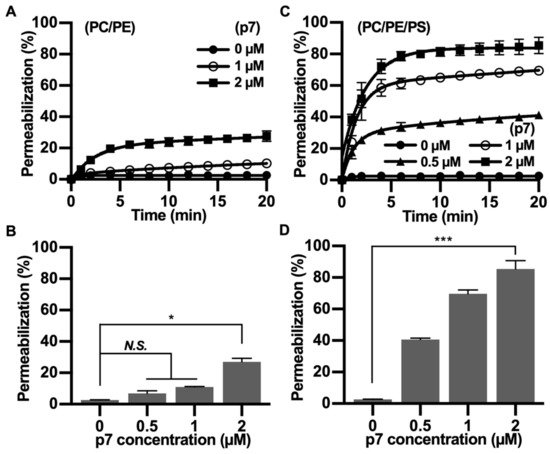 Since p7 has been mainly studied with fluorescent dye-encapsulated LUV, we tested the PS preference of p7 with carboxyfluorescein (CF)-encapsulated LUVs composed of PC:PE (Figure 3A,B) or PC:PE:PS (Figure 3C,D). We found that the p7-induced membrane permeabilization was much more potent in PS-containing LUVs, and this result is consistent with Figure 2. Therefore, we suggest that p7-induced membrane permeabilization could be related to an interaction between p7 and PS.