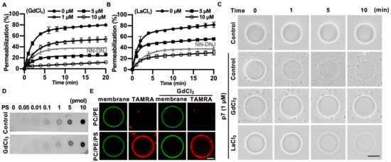 Inhibitory effects of GdCl3 or LaCl3 on p7-induced membrane permeabilization. (A,B) CF-encapsulated LUVs composed of PC:PE:PS, 3:1:1 (mol/mol), were incubated with 1 µM p7 and the indicated concentration of GdCl3 (A) or LaCl3 (B). Fluorescent signals were recorded by spectrophotometry. NN-DNJ (10 µM) was used as a positive control. (C) p7 (1 µM) was used for GUVs composed of PC:PE:PS, 3:1:1, in the presence of 10 µM GdCl3 or LaCl3 and incubated with external buffer (100 mM KCl, 100 mM sorbitol, 5 mM HEPES/Tris, pH 7). (D,E) Effects of 10 µM GdCl3 on the lipid preference of p7 by PLO assay (D) and targeting efficiency to GUV (E). The scale bar indicates 10 µm. NN-DNJ, N-nonyl-deoxynojirimycin.