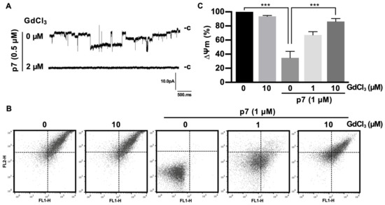As expected, Gd3+ ions significantly blocked the macroscopic currents triggered by p7 (Figure 5A). Because p7 has been known to target the ER, mitochondria, and plasma membrane, and can cause mitochondrial depolarization in cells [12] and in purified mitochondria [19], we isolated mitochondria from mouse liver and applied Gd3+ ions for 10 min, followed by staining with the ∆ψm indicator (JC-1) to examine the inhibitory effect on mitochondrial depolarization. We found that p7 induced mitochondrial depolarization, but Gd3+ ions had no significant effect on the membrane potential of intact mitochondria. However, Gd3+ ions inhibited the p7-induced mitochondrial depolarization significantly in a concentration-dependent manner (Figure 5B). Figure 5C shows the quantified data of Figure 5B by representing the FL-2/FL-1 ratio of the ∆ψm signal.