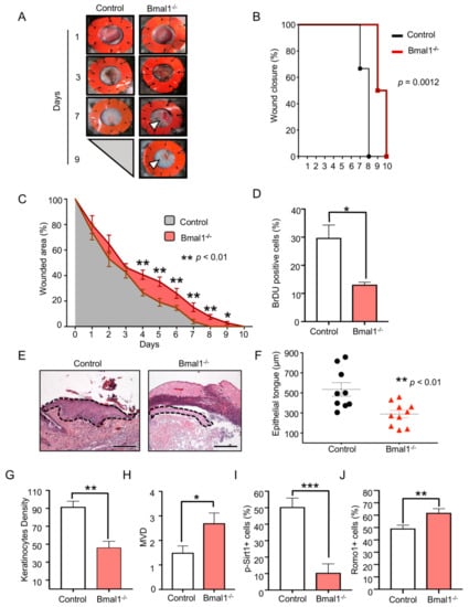 Bmal1 deletion affects Reactive Oxygen Species Modulator 1 (ROMO1) and phosphorylation of SIRT1 (p-SIRT1) activation and delays epithelial wound healing. (A) Representative photographs of wounds from Bmal1−/− and wild-type mice fitted with silicone splints at days 1, 3, 7, and 9 post-injury. (B) Graphic depicts the percentage of mice exhibiting wound closure identified among the control group (black line) and Bmal1−/− (red line) at indicated days. Note significant longer healing time for Bmal1−/− mice compared to wild-type mice (** p = 0.0012). (C) Open wound area of Bmal1−/− and wild-type mice during daily follow-up (n = 10/time point and group, percentage mean ± SEM (error bar), ** p < 0.01). (D) Quantification of bromodeoxyuridine (BrdU) positive cells present in the Bmal1−/− and wild-type mice (percentage mean ± SEM, * p < 0.05). The tissues were collected at day 5 post-injury. (E) Representative hematoxylin and eosin (H&E) stained skin wounds depicting the re-epithelialization of wounds on Bmal1−/− and wild-type mice. The black, dashed line delineates the migrating epithelial tongue over the wounded area (scale bar, 200 µm). (F) Dot plot graphic of the epithelial tongue length from Bmal1 and wild-type mice (mean ± SEM, ** p < 0.01). (G) Quantification of the keratinocytes presented in the epithelial tongues (mean ± S.E.M, n = 5 mice/group, ** p < 0.01). (H) Quantification of the microvessel density (MVD) of wounds from Bmal1−/− mice compared to wild-type mice (mean ± SEM, * p < 0.05). (I) The graphic shows the percentage of p-SIRT1 positive cells on Bmal1−/− mice and wild-type (percentage mean ± SEM, *** p < 0.001). (J) Graphic shows the percentage of ROMO1 positive cells in skin epithelial cells (percentage mean ± SEM, ** p < 0.01).