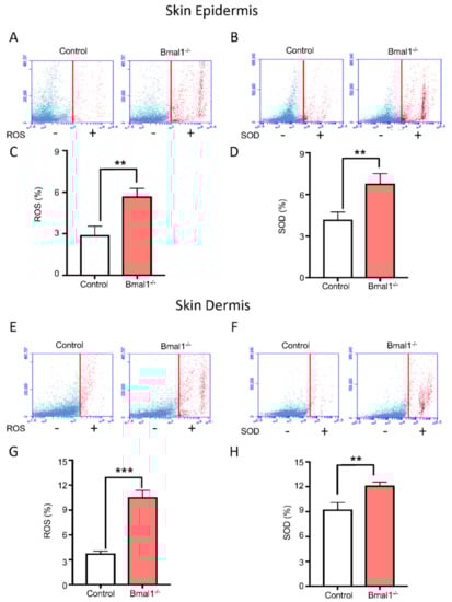 Bmal1 depletion triggers the accumulation of reactive oxygen species (ROS) and superoxide dismutase (SOD) in skin cells. (A,B) Schematic representation of flow cytometry assay showing quantification of ROS and SOD on epithelial cells derived from wild-type and Bmal1−/− mice as indicated. Note the positive cell population in red. (C,D) Graphics depict statistically significant accumulation of ROS and SOD in epithelial cells for ROS and SOD from Bmal1−/− and wild-type mice (percentage mean ± SEM, ** p < 0.01). (E,F) Schematic representation of flow cytometry assay for ROS and SOD levels on connective tissue-derived cells from wild-type and Bmal1−/− mice. (G,H) Graphics show the accumulation of ROS and SOD in cells derived from the connective tissue (percentage mean ± SEM, ** p < 0.01, *** p < 0.001).