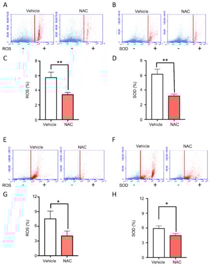 N-Acetyl-l-cysteine (NAC) reduces ROS and SOD levels from Bmal1−/− skin cells. (A,B) Representative flow cytometry data for ROS and SOD fluorescent markers on epithelial cells of Bmal1−/− mice treated with NAC or vehicle (positive cell population in red). (C,D) Graphic depicts epithelial cells from Bmal1−/− mice treated with 3% NAC topical gel. Note reduced levels of ROS and SOD on NAC-treated skin when compared to vehicle treatment (percentage mean ± SEM, ** p < 0.01). (E,F) Representative flow cytometry analysis of ROS and SOD levels present on the connective tissue-derived cells from Bmal1−/− mice receiving NAC and vehicle treatments. (G,H) Stromal-derived cells from Bmal1−/− mice treated with NAC showing reduced levels of ROS and SOD when compared to vehicle (percentage mean ± SEM, * p < 0.05).