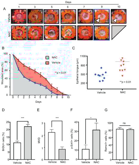 Administration of NAC rescues the Bmal1−/− phenotype. (A) Representative photographs of Bmal1−/− showing gradual wound closure on mice treated with daily topical applications of NAC or vehicle. (B) Graphic shows the percentage of open wound area on Bmal1−/− mice distributed by days and treatment (NAC: gray, vehicle: red) (percentage mean ± SEM, n = 5/group, ** p < 0.01). (C) Quantification of epithelial tongue length from mice receiving NAC or vehicle. Note accelerated healing time for Bmal1−/− mice receiving NAC (mean ± SEM, n = 9/treatment, ** p < 0.01). (D) Quantification of BrdU positive cells from mice receiving NAC or vehicle group (percentage mean ± SEM, * p < 0.05). (E) Quantification of microvascular density (MVD) present on wound bed treated with NAC or vehicle (mean ± SEM, *** p < 0.001). (F) Column bar graph depicting the percentage of nuclear p-Sirt1 positive stains on keratinocytes of mice with NAC or vehicle (percentage mean ± SEM, * p < 0.05). (G) Graphic shows the percentage of ROMO1 expressing cells in keratinocytes on mice treated with NAC or vehicle (percentage mean ± SEM, ns p > 0.05).