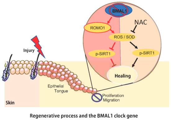 Here, we investigated the effects of BMAL1 during skin response to injury using a well-established skin injury model. Our results show that BMAL1 plays an important role in epithelial proliferation, migration, and wound closure. Depletion of BMAL1 negatively impacts epidermal healing and triggers the buildup of Reactive Oxygen Species Modulator 1 (ROMO1) and intracellular accumulation of reactive oxygen species (ROS). Notably, topical application of N-Acetyl-l-cysteine (NAC) reversed the deleterious effects of ROS accumulation and rescued the BMAL1 slow-healing phenotype.
