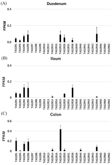 Expression levels of TAS2Rs as measured by RNAseq, which was performed using samples from the rhesus macaque duodenum (A), ileum (B), and colon (C). Each n = 3.