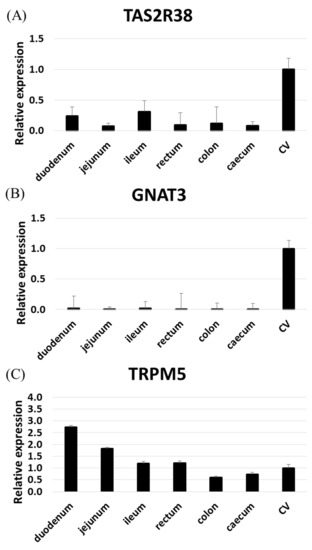 - Vegezzi, G.; Anselmi, L.; Huynh, J.; Barocelli, E.; Rozengurt, E.; Raybould, H.; Sternini, C. Diet-induced regulation of bitter taste receptor subtypes in the mouse gastrointestinal tract. PloS ONE 2014, 9, e107732. [Google Scholar] [CrossRef] [PubMed]
