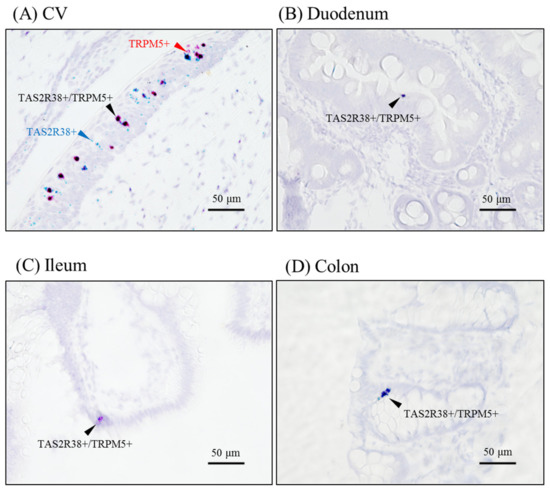The mRNA localization in the CV and gut, as determined by RNAscope. Probes for TAS2R38 (blue) and TRPM5 (red) were hybridized and visualized in the rhesus macaque CV (A), duodenum (B), ileum (C), and colon (D). Arrowheads indicate TAS2R38+/TRPM5+ cells. Bar = 50 µm.