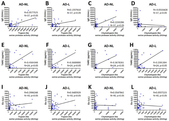 The correlations between serine protease activity in the SC and biomarkers of AD. The correlations between trypsin- or chymotrypsin-like serine protease activity in non-lesions (AD-NL) or lesions (AD-L) and the serum total IgE levels (A–D), serum TARC levels (E–H) and the peripheral blood eosinophil counts (Eo) (I–L) of the AD patients were analyzed by Spearman’s rank correlation coefficient.