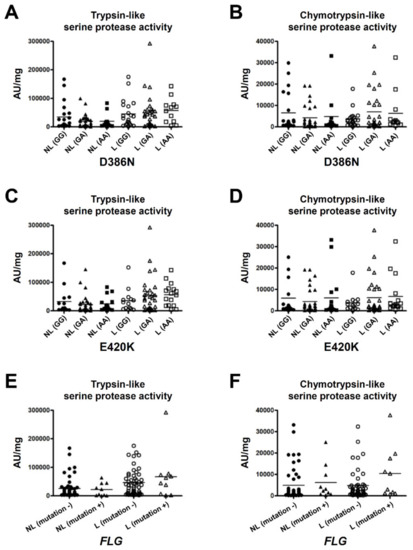 To clarify the association between serine protease activity in the SC and the AD-related gene variants, we analyzed FLG mutations in the AD patients. Eighteen of the 115 patients (15.7%) had one of the ten FLG mutations. We were able to perform protease assays with the SC samples from 61 of the AD patients. Ten of the 61 patients (16.4%) had the FLG mutations: p.Q1701X (n = 1), p.S2554X (n = 1), p.S2889X (n = 4), p.S3296X (n = 2) and p.K4022X (n = 2). We also analyzed p.D386N (c.G1156A) and p.E420K (c.G1258A) of SPINK5 in the AD patients. In respect of p.D386N, the numbers of the genotypes were as follows: GG (n = 21), GA (n = 28), and AA (n = 12). For p.E420K, the numbers of the genotypes were as follows: GG (n = 14), GA (n = 31), and AA (n = 16). The trypsin- and chymotrypsin-like serine protease activity in the SC was not significantly different among the subgroups of p.D386N (Figure 4A,B) or p.E420K (Figure 4C,D). In addition, FLG mutations did not significantly affect the trypsin- or chymotrypsin-like serine protease activity of the SC in the AD patients (Figure 4E,F).