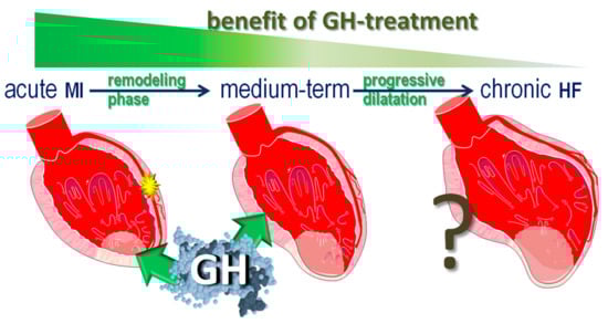 - Mitsi, A.C.; Hatzistergos, K.; Baltogiannis, G.G.; Kolettis, T.M. Early, selective growth hormone administration may ameliorate left ventricular remodeling after myocardial infarction. Med. Hypotheses 2005, 64, 582–585. [Google Scholar] [CrossRef] [PubMed]