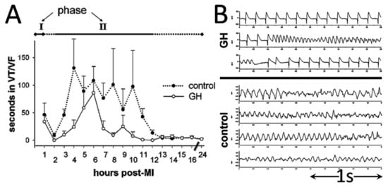 The first study, performed by our group, quantified VTs from continuous electrocardiography, obtained by means of implanted miniature telemetry transmitters [14]. These devices permit long-term recordings in conscious animals without the confounding effects of anesthesia, thereby enabling the assessment of early (phase-I) and delayed (phase-II) VTs in our protocol. We found that phase-I VTs were unaffected, but we observed lower arrhythmogenesis in rats pre-treated with GH during phase-II (Figure 2), resulting in lower arrhythmic and total mortality 24 h post-MI. These favorable results were subsequently confirmed by another group [15], reporting lower incidence of spontaneous and induced VTs by programmed electrical stimulation; the antiarrhythmic effect of GH was found comparable to that elicited by amiodarone, a potent agent, well-characterized in this regard [16].