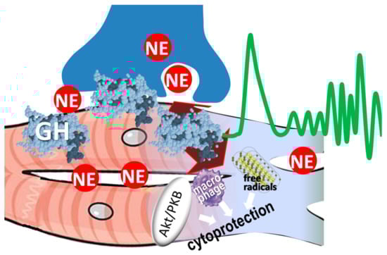 The hitherto available evidence [14,15,26,30], examined collectively, is useful in formulating the hypothesis that GH may act locally on sympathetic nerve terminals, decreasing local norepinephrine release during acute MI (Figure 3). The latter process, occurring independently of central sympathetic activity, has long been recognized as a key element of arrhythmogenesis during acute ischemia and evolving MI [31]. Its importance is underscored by studies using various experimental models such as the ex vivo, Langendorff-perfused heart preparation or after in vivo sympathetic denervation, indicating critical involvement of local norepinephrine in myocardial necrosis and in the occurrence of VTs [32].