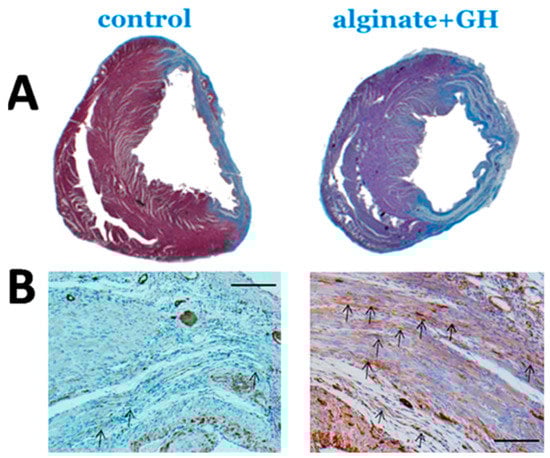 Structural remodeling. (A) Infarct thickness (Heidenhain’s AZAN-trichrome staining, scale: 500 mm) was preserved after treatment with growth hormone (GH), administered via an alginate scaffold. (B) Myofibroblast density in the peri-infarct-area (α-smooth-muscle-actin staining, arrows, scale: 50 mm) was higher after treatment. Adapted from Daskalopoulos et al., Growth Factors 33 (2015) 250–258 [37], with permission.