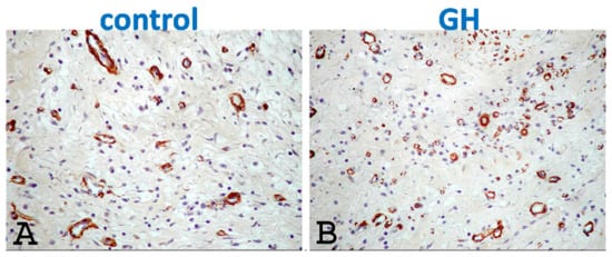 Our group has further examined the efficacy of a single dose of GH, administered selectively in the infarcted area via the intracoronary route in a large animal (porcine) model; we reported increased infarct thickness and enhanced angiogenesis in the peri-infarct area (Figure 5), leading to improved remodeling indices [43]. The intracoronary route for GH administration increases the translational value of this approach, rendering high clinical relevance in patients undergoing primary percutaneous interventions (PCI). Such early intervention aims at the (likely more attainable) prevention of LV remodeling, as opposed to its reversal at subsequent stages of overt heart failure. This concept was subsequently confirmed in a similar large animal model [19] after a single dosage of IGF-1 [44]. The intracoronary approach surfaced later into a small-scale clinical trial performed by the same investigators in patients with acute MI undergoing PCI [45]. The study randomized 47 such patients with depressed LV function after successful PCI into three groups, namely high-dose IGF-1, low-dose IGF-1, and saline, in addition to optimal medical therapy. No safety concerns were raised during or after intracoronary administration. Two months post-MI, remodeling-indices were improved after high-dosage IGF-1, as shown by smaller LV dimensions and mass, as well as higher stroke volume; there was also evidence of decreased fibrosis examined by late gadolinium enhancement in magnetic resonance imaging [45]. We feel that these very encouraging results call for larger scale clinical trials in acute MI.