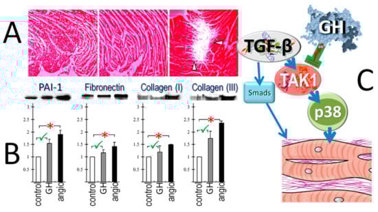 GH treatment post-MI appears to elicit two distinct effects, namely enhanced healing in the infarcted [11] and surrounding myocardium [21,40], along with attenuated fibrotic response in the non-infarcted myocardium [23,51]. Although the activation of fibroblasts selectively in the infarct and peri-infarct areas explains the former action, the mechanisms underlying the latter remain speculative, with two potential explanations having been brought forward [53,59]. The first refers to apoptosis in the non-infarcted myocardium, with the ensuing replacement fibrosis caused by residual interstitial edema, characterized by high fibrinogen content [60]. Based on the anti-apoptotic properties of GH, the prevention of subsequent interstitial edema may eventually attenuate fibrosis and, thereby, structural remodeling of the non-infarct zone [53]. A second, perhaps more likely, explanation for the absence of remote fibrosis refers to the actions of GH on transforming growth factor-β (TGF-β), a crucial regulator of fibrosis. Specifically, extracellular matrix and LV systolic and diastolic function remained normal after chronic GH-excess in rats, in contrast to the pattern observed after low-dosage angiotensin-II administration. Moreover, the expression of plasminogen activator inhibitor-1, as a marker of fibrosis caused by TGF-β, was increased after angiotensin II, but only marginally after GH; of note, a similar pattern was seen in fibronectin, collagen-I, and collagen-III (Figure 8). These findings indicate that the effects were mediated by a direct action of GH, causing suppression of TGF-β signaling via de-phosphorylation of p38 MAPK [59]. Based on these data, it seems that an important action of GH in the post-MI setting lies within the prevention of fibrosis in the remote, non-infarcted myocardium [53].