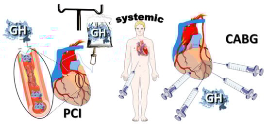 Routes for Growth hormone (GH) administration. GH could be administered via the intracoronary route in patients undergoing primary percutaneous interventions (PCI) for acute myocardial infarction. Direct intra-myocardial injections present an alternative route in patients undergoing coronary artery bypass grafting (CABG); it has the advantage of sustained action of GH via scaffolds enabling controlled release. Systemic administration is a valid option in the remaining patients.