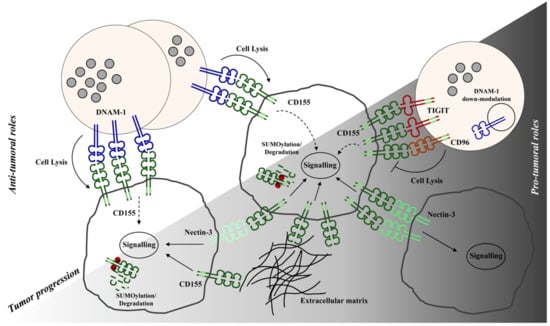 CD155 also exerts an anti-tumorigenic role participating in immune response to tumors. Indeed, it is considered a stress-induced molecule able to activate a danger signal, alerting the immune system against tumor transformation. In particular, CD155 once up-regulated on different types of tumor cells is recognized by a group of receptors expressed on T and NK cells: The activating receptor DNAM-1 (CD226) and the inhibitory receptors TIGIT and TACTILE (CD96) [22,23,37].