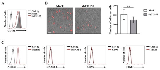 Interestingly, even though CD155 is involved in cell movement, its binding to Nectin3 on adjacent cells may facilitate cell-cell interactions [32]. Accordingly, we demonstrated that on Multiple Myeloma (MM), a hematopoietic tumor in which malignant plasma cells proliferate in the bone marrow niche, CD155 promotes MM cell adhesion to bone marrow stromal cells (BMSCs) (Figure 2). In particular, we found that shRNA-mediated CD155 knock-down dramatically decreases the number of MM/BMSC adherent cells (Figure 2A,B). Moreover, we also provided evidences that the only ligand of CD155 expressed on BMSCs is Nectin3 (Figure 2C), strongly suggesting its involvement in MM cell adhesion to stromal cells. Whether CD155/Nectin3 interaction also contributes to MM cell survival is under investigation.