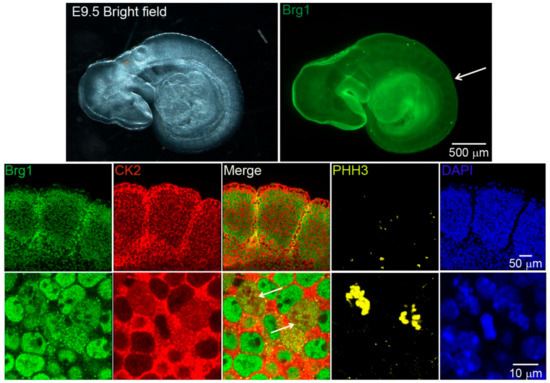 Embryos were collected at E9.5 and were fixed with phosphate-buffered 10% formalin overnight at 4 °C. The next day, the embryos were washed three times with PBS for 10 min and permeabilized with PBT buffer (0.5% Triton-X100 in PBS) for 10 min at room temperature. Samples were incubated with blocking solution for 1 h (PBT, 5% horse serum) at room temperature. The embryos were incubated with the primary antibodies against CK2 and Brg1 (1:100) in blocking solution overnight at 4 °C. The samples were then washed three times with PBT solution for 10 min at room temperature, then incubated with species-specific fluorescent secondary antibody (1:500) in PBT for 2 h at room temperature and washed three times with PBT solution for 10 min at room temperature. Samples were incubated with the anti-PHH3 antibody for 2 h at room temperature, followed by a 30 min incubation with 4′,6-diamidino-2-phenylindole (DAPI). Negative controls were prepared as described above, but no primary antibodies were included. Embryos were washed three times with PBT at room temperature for 10 min, and a final wash was performed with PBS for 10 min at room temperature. Embryos were equilibrated with sequential 15 min incubations of PBS:glycerol solutions (1:1, 1:2) and mounted in Vectashield containing DAPI (Vector Labs). Imaging was performed with a Leica TCS SP5 confocal laser scanning microscope (Leica) using a 40× water immersion objective.