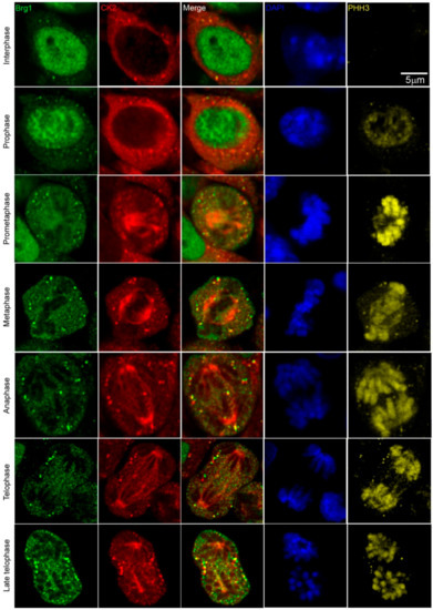 - Muchardt, C.; Reyes, J.C.; Bourachot, B.; Leguoy, E.; Yaniv, M. The hbrm and brg-1 proteins, components of the human snf/swi complex, are phosphorylated and excluded from the condensed chromosomes during mitosis. EMBO J. 1996, 15, 3394–3402. [Google Scholar] [CrossRef]