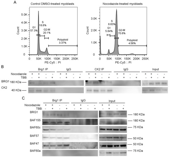 Inhibition of CK2 enzymatic activity does not impair its interaction with Brg1 or affect the interaction of Brg1 with numerous mammalian SWItch/Sucrose Non-Fermentable (mSWI/SNF) complex proteins. Primary myoblasts were treated or not with 500 nM nocodazole and 10 µM tetrabromobenzotriazole (TBB). (A) Representative fluorescence-activated cell sorting (FACS) analyses of primary myoblasts treated or not with nocodazole. (B) Representative Western Blots from a reciprocal immunoprecipitations of Brg1 (left panel) or CK2 (middle panel). IgG inputs (IPs) and input (1%) for both proteins are shown as controls. (C) Representative Western Blots of Brg1 immunoprecipitation and Western Blots for the mSWI/SNF subunits BAF155, BAF60c, BAF57, BAF47, and BAF60a. IgG and inputs (2%) for all samples were included as controls. Three independent biological replicates were performed.