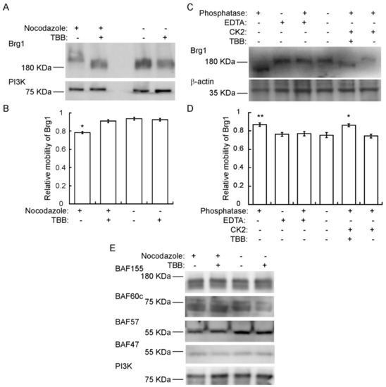 We subsequently examined the mobility of the other subunits tested in Figure 3C on Phos-Tag™ gels. BAF155, BAF60c, and BAF57, but not BAF47, show two or more bands that are presumably due to differential phosphorylation (Figure 4E). No easily discernable changes in gel mobility were observed due to the presence of TBB. These data do not exclude the possibility that CK2 phosphorylates any of these mSWI/SNF subunits, but the data do demonstrate that large mobility shifts such as that shown by the CK2-dependent phosphorylation of Brg1 do not occur in these other subunits.