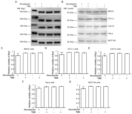 To determine whether the CK2-dependent phosphorylation of Brg1 during mitosis is part of a skeletal muscle-specific regulatory mechanism or is more widespread, we examined other cell types arrested in mitosis. We tested Brg1 gel mobility in Phos-Tag™ gels using Madin-Darby canine kidney (MDCK) epithelial cells, murine 3T3-L1 pre-adipocytes, murine C2C12 myoblasts, HeLa human cervical cancer cells, and human mammary epithelial MCF10A cells. Each of these are immortalized cell lines, in contrast to the primary cells tested in the experiments presented in Figure 1, Figure 2, Figure 3 and Figure 4. HeLa cells are a transformed cancer cell line. Representative Western Blots from Phos-Tag™ gels show that in each cell type, Brg1 from cells grown in the presence of nocodazole migrated with reduced mobility, in contrast to the mobility observed in control cells (Figure 5). β-actin levels were monitored as a control. The reduced migration of Brg1 observed in samples enriched for mitotic cells was significant, as shown by the calculation of relative mobility in each of these cell lines (Figure 5C–G). These results suggest that CK2-dependent phosphorylation of Brg1 is a conserved event during mitosis of different cell types originating from different mammalian species.